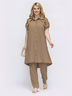 Летний костюм-двойка. Туника свободного кроя с удлиненной спинкой. Застёгивается на пуговицы по полочке. Брюки с эластичной деталью по талии. По бокам предусмотрены карманы.
