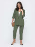 Комплект-двойка в узкую полосу из костюмного крепа. Жакет с рукавом ¾ и разрезом по спинке. Укороченные брюки с вместительными карманами по бокам.