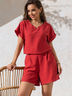 Уютный комплект на каждый день из жатой льняной ткани. Свободная блузка со спущенным цельнокроеным рукавом и разрезами по бокам. Шорты с эластичной деталью в поясе и карманами в боковых швах.