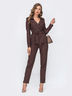Классический брючный костюм с принтом «гусиная лапка». Двубортный жакет с лацканами дополнен шлевками для пояса. Брюки с карманами в боковых швах, по талии эластичная деталь.