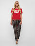 Комплект-двойка из принтованного штапеля. Футболка с декоративным трикотажным довязом в полоску. Брюки свободного кроя с эластичной деталью в поясе и карманами по бокам.