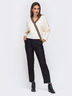 Лаконичный комплект из трикотажной кофты и кашемировых брюк. Кофта с рукавом реглан выполнена на запах с контрастной лентой. Брюки с прорезными карманами по бокам и отстроченными стрелками. Талия выполнена эластичной деталью. Застегиваются на скрытую молнию сбоку.
