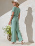 Повседневный брючный комплект из тонкого льна с жатым эффектом. Прямая блузка с коротким рукавом и небольшими разрезами по бокам. Широкие брюки-клёш с эластичной деталью на спинке. Для удобства сзади и в боковых швах предусмотрены карманы. Костюм прекрасно подойдет для ежедневного посещения офиса, деловой встречи и даже для прогулки по окончанию рабочего дня.