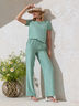 Повседневный брючный комплект из тонкого льна с жатым эффектом. Прямая блузка с коротким рукавом и небольшими разрезами по бокам. Широкие брюки-клёш с эластичной деталью на спинке. Для удобства сзади и в боковых швах предусмотрены карманы. Костюм прекрасно подойдет для ежедневного посещения офиса, деловой встречи и даже для прогулки по окончанию рабочего дня.