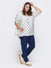 Брючный комплект с блузкой свободного кроя в «горох». Блузка с удлинённой спинкой и капюшоном застегивается на деревянные пуговицы спереди. Длина рукава регулируется патиками. Пояс брюк выполнен на резинке.