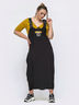 Оригинальный комплект с однотонным сарафаном из софта и трикотажной футболкой в полоску. Сарафан свободного кроя с широкими бретелями из кожзама и карманами. Футболка с завязками на горловине.