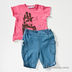 Костюм-двойка для девочки с джинсовыми штанишками и оригинальным принтом "жирафа" на маечке.