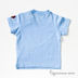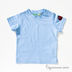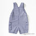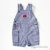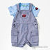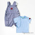 Костюм-двойка состоит из однотонной майки с нашивкой и штанов с грудкой из плотной полосатой ткани.