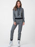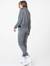 Костюм (свитшот и брюки) из трикотажа. Детали свитшота: воротник-стойка с кулиской, шнурок в стойке, спущенная линия плеча, втачной рукав с манжетой присборенной на резину, по переду притачной пояс из отделочного кашкорсе, по спинке притачной пояс из основного материала присборенный на резину. Детали брюк: притачной пояс из основного материала, боковые карманы, по низу переда брюк манжета из кашкорсе, по низу спинки брюк манжета из основного материала присборенная на резину.