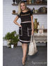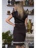 Костюм, состоящий из топа и юбки. Топ с полукруглой горловиной, рукава короткие - до предплечий. Юбка миди, с замшевой талией на широком поясе. Есть два кармана. Низ топа и юбки отделаны полосами из полупрозрачной ткани.