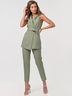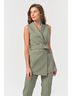 • Особенности: Комплект из костюмной ткани, состоящий из жилета полуприлегающего силуэта на подкладке и зауженных брюк. Детали жилета: шалевый воротник, пояс из основной ткани с пряжкой в комплекте, шлевки в боковых швах, правый борт с провисанием, застежка на потайные кнопки. Детали брюк: широкий притачной пояс со шлевками, застроченные стрелки по переду, боковые карманы, застежка на молнию и крючок.