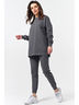 • Особенности: Костюм из плотного трикотажа в крапинку состоит из свитшота и брюк. Свитшот свободного силуэта, горловина обработана бейкой, рукав длинный со спущенной проймой, по низу изделия - манжета, разрезы в боковых швах, карманы в боковых швах. Брюки полуприлегающего силуэта, заужены книзу, на манжете.