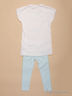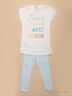 Костюм состоит из двух предметов: леггинсы и футболка. Леггинсы облегающего покроя с эластичным поясом, футболка с короткими рукавами и округлым вырезом горловины. Спереди модель декорирована принтом.