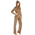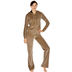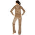 Мягкий домашний костюм с капюшоном из велюра кофейного цвета. Отверстия для шнурка на брюках и капюшоне отделаны металлическими вставками, велюровый шнурок украшен металлическими колокольчиками, пластиковая молния - слайдером из металла со стразами. Карманы, рукава и низ куртки, пояс брюк отделаны трикотажной резинкой. Верхняя часть куртки декорирована вышивкой со стразами.