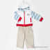 Костюм для мальчика. Олимпийка в капюшоном на кулиске, манжеты и низ изделия в виде трикотажной резинки, два кармана. Декорирована принтом-полоска и контрастными вставками. Брюки на резинке с двумя карманами.