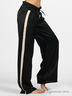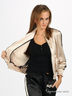 Гламурный женский костюм, состоящий из кофты и брюк. Ткань шелковистая, с отливом. Кофта укороченного силуэта, застегивается на молнию. Воротник-стойка. Декоративные лампасы на рукавах. Карманы присборены на резинку. На спинке аппликация. Широкие брюки так же декорированы лампасами. Пояс на резинке и дополнительной шнуровке.