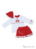 Костюм состоит из лонгслива, юбки и шапочки. Лонгслив с воротом-стойка и длинным рукавом застегивается на кнопки на плече. Юбка на резинке дополнена оборкой по низу. Шапочка с нашивкой в форме вышивки. Комплект декорирован принтами.