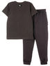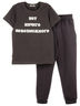 Костюм из двух предметов. Футболка с коротким рукавом, в горловине манжет, спереди стильный принт. Брюки с двумя карманами с отрезным бочком, в поясе регулируемый шнур. Футболка изготовлена из кулирки с эластаном, брюки из 2х ниточного футера с эластаном.
