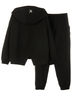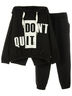 Толстовка модели "оверсайз", со спущенной проймой, рукав на резинке. В капюшоне шнур. Укороченный перед толстовки на резинке, внизу спинки декоративный вырез. Низ брюк на резинке, в поясе шнур, имеют два кармана с отрезным бочком. Костюм изготовлен из 2х ниточного петельчатого футера с эластаном. По переду симпатичный принт.