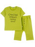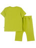Футболка с застежкой на кнопки на плече, по переду стильный принт. Изготовлена из кулирки с эластаном. Брючки укороченные, два кармана с отрезным бочком, на гульфике декоративные пуговички. Изготовлены из 2-х ниточного петельчатого футера с эластаном.