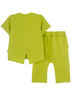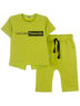 Футболка с коротким рукавом, по переду стильный принт. Спинка удлиненная, с декоративным элементом. Изготовлена из кулирки с эластаном. Брючки укороченные, два кармана с отрезным бочком, на поясе декоративная лента. Изготовлены из 2-х ниточного петельчатого футера с эластаном.
