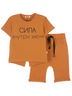 Футболка с коротким рукавом, по переду стильный принт. Спинка удлиненная, с декоративным элементом. Изготовлена из кулирки с эластаном. Брючки укороченные, два кармана с отрезным бочком, на поясе декоративная лента. Изготовлены из 2-х ниточного петельчатого футера с эластаном.