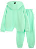 Толстовка модели "оверсайз", со спущенной проймой, рукав на резинке. В капюшоне шнур. Укороченный перед толстовки на резинке, внизу спинки декоративный вырез. Низ брюк на резинке, имеют два кармана с отрезным бочком. Костюм изготовлен из 2х ниточного петельчатого футера с эластаном.