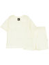 Футболка силуэта оверсайз со спущенной линией плеча. Изготовлена из кулирки с эластаном. Спереди классный принт. Объемные шорты средней длины с отворотами, с двумя карманами. В поясе регулировочный шнур. Изготовлены их 2х-ниточного футера с эластаном, без начеса.