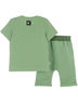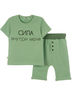 Футболка с застежкой на кнопки на плече, по переду стильный принт. Изготовлена из кулирки с эластаном. Брючки укороченные, два кармана с отрезным бочком, на гульфике декоративные пуговички. Изготовлены из 2-х ниточного петельчатого футера с эластаном.