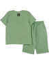 Футболка прямого силуэта. Спереди модный принт. Шорты с карманами с отрезным бочком. В поясе шнур-утяжка. Шорты из петельчатого футера, футболка из кулирки с эластаном.