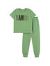 Базовая футболка прямого силуэта из кулирки с эластаном. Спереди стильный принт. Брюки на манжетах внизу.
