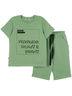 Футболка прямого силуэта. Спереди модный принт. Шорты с карманами с отрезным бочком. В поясе шнур-утяжка. Шорты из петельчатого футера, футболка из кулирки с эластаном.