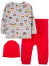 Лонгслив с длинным рукавом на манжете. В горловине планка. Брючки на манжетах. Изготовлен комплект из полотна интерлок. Шапочка с декоративным элементом.