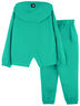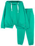 Толстовка модели "оверсайз", со спущенной проймой, рукав на резинке. В капюшоне шнур. Укороченный перед толстовки на резинке, внизу спинки декоративный вырез. Низ брюк на резинке, имеют два кармана с отрезным бочком. Костюм изготовлен из 2х ниточного петельчатого футера с эластаном.