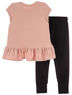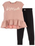 Туника с коротким рукавом, по низу баска, перед укорочен, в горловине манжет. Спереди принт со стразами. Леггинсы длинные, внизу на манжетах. Изготовлен комплект из кулирки с эластаном.