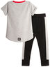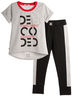 Футболка-туника с коротким рукавом, перед укорочен. По переду стильный принт. Рукава с подворотами. Изготовлена из кулирки с лайкрой. Облегающие леггинсы на манжетах, с боковой вставкой. В поясе эластичная тесьма. Изготовлены из кулирки с лайкрой.