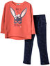 Свитшот с длинным рукавом на манжете, спереди симпатичный принт. Перед укорочен и имеет два разреза. Брюки с карманами-хулиганами. Брюки заужены к низу и имеют отвороты. Комплект изготовлен из петельчатого футера с лайкрой.