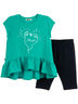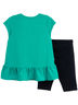 Туника с коротким рукавом, по низу баска, перед укорочен, в горловине планка. Леггинсы укороченные, ниже колена. Изготовлен комплект из кулирки с эластаном.