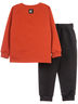 Свитшот с длинным рукавом на манжете, в горловине планка. Брюки на манжетах, спереди карманы с отрезным бочком. Изготовлен из петельчатого футера с эластаном.