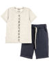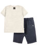 Футболка с коротким рукавом, в горловине манжет. Спереди модный принт. Изготовлена из кулирки с лайкрой. Шорты удлиненные, спереди карманы с отрезным бочком. Сзади один накладной карман. Низ шорт подвернут. В поясе продернут шнур. Изготовлены из петельчатого футера с эластаном.
