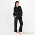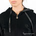 Стильный домашний костюм из мягкого велюра с капюшоном. Низ куртки, руква и пояс брюк отделаны широкой резинкой. Левая полочка куртки декорирована шитьем -логотипом с мелкими черными стразами. Скрытая молния куртки украшена изящным слайдером-логотипом LB со стразами. Два кармана куртки с атласной отделкой создают эффект кармана "кенгуру". Внутренняя сторона капюшона имеет атласную подкладку черного цвета. Кулиска капюшона с атласным шнурком позволяет регулировать плотность его прилегания. Пояс брюк на резинке с атласным шнурком дополнен боковыми карманами с атласной отделкой.