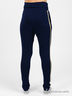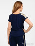 Оригинальный костюм выполнен из тонкого, мягкого, эластичного трикотажа со вставками из ткани с покрытиями под кожу. Состоит из футболки-фрака и брюк. У футболки округлый вырез горловины. Короткий цельнокроеный рукав. Плечи декорированы полосами ткани с эффектом кожи. Фигурная линия подола. У брюк широкий отрезной пояс на резинке. Заниженная пройма. Зауженные брючины. Два прорезных кармана. Боковые швы декорированы вставками ткани с эффектом кожи.