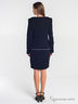 Костюм из фактурного трикотажа: жакет и платье. Платье плотно прилегающего силуэта, длиной выше колена, с фигурными рельефами выходящими из проймы и заканчивающимися к низу изделия. По центру спинки расположена потайная молния. Жакет на вискозной подкладке декорирован контрастной тесьмой – косичкой по линии горловины, карманам и низу рукава.