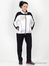 Cпортивный костюм состоящий из куртки и брюк. Куртка с воротником стойкой, застёгивающаяся на тесьму-молнию, по низу с поясом. Куртка по переду с оригинальным цветочным принтом. перед с кокеткой и рельефными швами с листочкой дополненными хальнитенами. Спинка с кокеткой и рельефными швами. Рукав спущенный с манжетой. В рельефные швы переда и спинки, край борта отделан кантом отделочным. Брюки с карманом с подрезным бочком, с притачным поясом с тесьмой эластичной. костюм выполнен с применением трикотажного полотна двух цветов. Костюм декорирован хольнитенами.