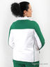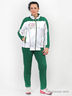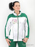 Cпортивный костюм состоящий из куртки и брюк. Куртка с воротником стойкой, застёгивающаяся на тесьму-молнию, по низу с поясом. Куртка по переду с оригинальным цветочным принтом. перед с кокеткой и рельефными швами с листочкой дополненными хальнитенами. Спинка с кокеткой и рельефными швами. Рукав спущенный с манжетой. В рельефные швы переда и спинки, край борта отделан кантом отделочным. Брюки с карманом с подрезным бочком, с притачным поясом с тесьмой эластичной. костюм выполнен с применением трикотажного полотна двух цветов. Костюм декорирован хольнитенами.