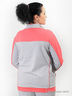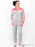 Cпортивный костюм состоящий из куртки и брюк. Куртка с воротником стойкой, застёгивающаяся на тесьму-молнию, по низу с поясом. Куртка по переду с оригинальным цветочным принтом. перед с кокеткой и рельефными швами с листочкой дополненными хальнитенами. Спинка с кокеткой и рельефными швами. Рукав спущенный с манжетой. В рельефные швы переда и спинки, край борта отделан кантом отделочным. Брюки с карманом с подрезным бочком, с притачным поясом с тесьмой эластичной. костюм выполнен с применением трикотажного полотна двух цветов. Костюм декорирован хольнитенами.