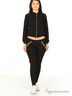 Костюм из тонкого трикотажа. Кофта с капюшоном. Длинные рукава украшены вставками из шелковистой ткани. Накладные карманы. Застежка-молния. Брюки зауженного кроя фиксируются на широкой резинке. Втачные карманы и боковые швы изделия декорированы вставками.