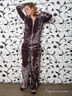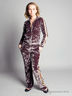 Костюм из мягкого велюра. Кофта: воротник-стоечка, длинные рукава со вставками, застежка-молния. Брюки: фиксируются на широкой резинке, втачные карманы, вставки по бокам.