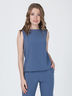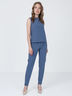 Костюм из костюмной ткани в полоску, состоит из брюк и топа. Топ прямого силуэта в заднем шве потайная молния, округлый вырез горловины и пройма обработаны цельной обтачкой. Брюки полуприлегающего силуэта на поясе заужены к низу. По верху модели заложены защипи, обеспечивающие свободу облегания. Гульфик с застежкой на молнию и одну пуговицу, на уровне бедер расположены прорезные карманы.
