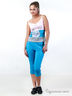 Майка приталенного силуэта, на тонких бретелях. Горловина V-образной формы, обработана бейкой. Полочка резная, состоит из трех частей. Бриджи с заниженной линией талии, на широком поясе, на передних половинках обработаны прорезные карманы. Печать располагается по центру полочки.